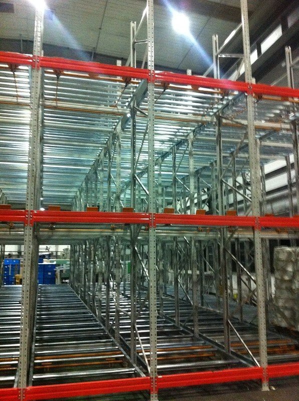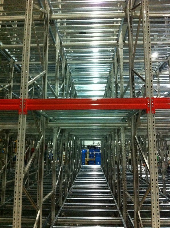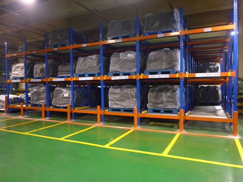 在貨架的組與組之間沒有作業(yè)通道,從而增加了60%的空間利用率,提高了倉儲的容積率;托盤操作遵循先進先出的原則;自動儲存回轉(zhuǎn);儲存和揀選兩個動作的分開大大提高輸出量,由于是自重力使貨物滑動,而且沒有操作通道,所以減少了運輸路線和叉車的數(shù)量。